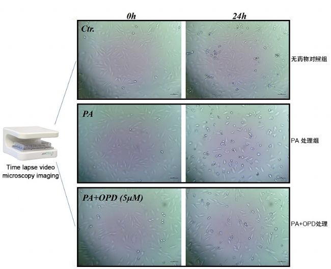 麥冬作為一種傳統(tǒng)中藥藥材,富含甾體皂苷(如OP-D)、同型異黃酮和多糖等多種生物活性化合物。據(jù)報道,OP-D可調(diào)節(jié)和緩解炎癥、心血管疾病等病癥,如改善急性心肌梗死和血管緊張素Ⅱ誘導(dǎo)的心肌肥厚,降低阿霉素誘導(dǎo)的心肌細胞死亡等。為進一步驗證OP-D的作用機理,文章中,H9C2大鼠心肌細胞分別接受100μM棕櫚酸(PA)/PA+OP-D(5μM)/無藥物對照組的處理,并通過zenCELL owl活細胞動態(tài)成像及分析系統(tǒng)(以下簡稱zenCELL owl),在培養(yǎng)箱中實時監(jiān)測整個變化過程(如圖)。圖中0h和24h時間點的監(jiān)測圖像,顯示PA處理組的細胞凋亡數(shù)量,明顯高于PA+OP-D處理組和無藥物對照組,這一結(jié)果也得到流式和Western Blotting兩種方法學(xué)的驗證一致性。