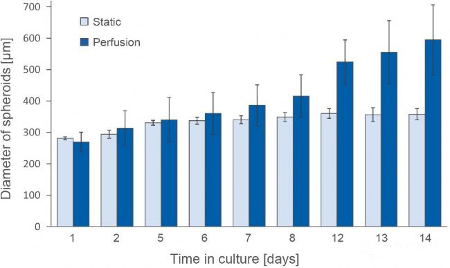 接種后立即開(kāi)始形成球體。在長(zhǎng)期培養(yǎng)過(guò)程中,施加流量會(huì)導(dǎo)致球體更強(qiáng)的增殖,由于最佳營(yíng)養(yǎng),導(dǎo)致球體直徑增加。