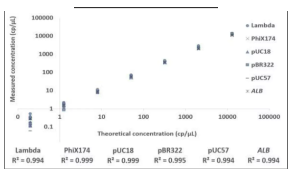 ▲ 圖1:使用naica®multiplex PCR MIX在naica®六通道微滴芯片數(shù)字PCR上進(jìn)行6個(gè)靶標(biāo)的線性分析,分別在藍(lán)色、青色、綠色、黃色、紅色和紅外線6個(gè)通道進(jìn)行檢測。每個(gè)稀釋點(diǎn)的DNA濃度分別為:0.2、1.5、8.0、50、320、2050和13000 cp/ul,每個(gè)稀釋度進(jìn)行3次重復(fù)。結(jié)果顯示6個(gè)靶標(biāo)的R2均大于0.99,說明所有靶標(biāo)的結(jié)果都高度真實(shí)可靠。