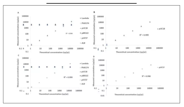 ▲ 圖2:使用naica®multiplex PCR MIX的擴(kuò)增結(jié)果真實(shí)可靠。將pUC18質(zhì)粒(圖A和B)和pUC57質(zhì)粒(圖C和D)的13000至0.2 cp/ul的系列稀釋液在5個(gè)外部擴(kuò)增靶標(biāo)背景下(每個(gè)靶標(biāo)為3000 cp/ul(A,C))和在不含外部靶標(biāo)(B,D)的情況下進(jìn)行定量檢測,3次重復(fù)。線性擬合系數(shù) R2>0.99,表明在不考慮多重背景的情況下,對(duì)所有靶標(biāo)的測定結(jié)果都是真實(shí)可靠的。5個(gè)外部靶標(biāo)的相對(duì)標(biāo)準(zhǔn)偏差保持在2.3%至3.1% (n=21),顯示出極好的重復(fù)性。