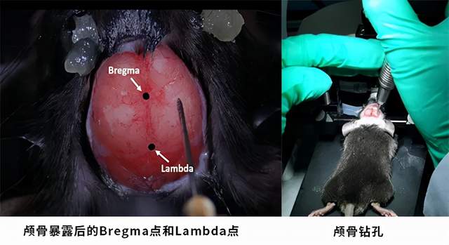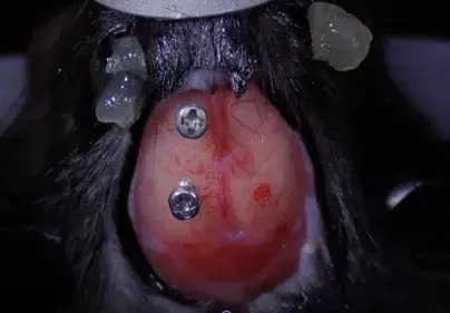 - 在目標標記點處用顱鉆進行開顱并挑開硬腦膜。此外還需鉆兩個預留孔,用于埋植顱釘。如果鉆孔過程發(fā)生出血,使用棉簽清潔血液,然后使用一塊可吸收的海綿來止血。