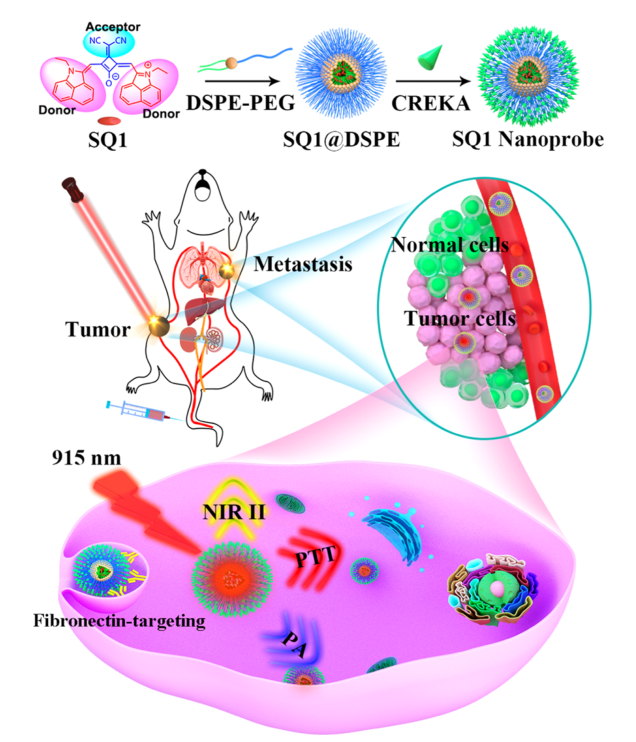 結(jié)論:通過合理的D-A-D工程,合成了一種發(fā)射延伸至第二窗口的方堿染料。方酸染料SQ1通過簡(jiǎn)單的納米沉淀和靶向多肽修飾可以被包裹成SQ1納米探針,顯示出NIR-II/PA雙峰成像能力和良好的光熱效應(yīng)。小鼠的NIR-II顯像表明,SQ1納米探針適合于血管造影和腫瘤靶向顯像,尤其是肺轉(zhuǎn)移灶。此外,SQ1納米探針利用在近紅外輻射下優(yōu)異的光熱轉(zhuǎn)換能力,在實(shí)體腫瘤的PA成像和PTT中都表現(xiàn)良好。考慮到它在NIR-II區(qū)域的治療學(xué)的固有優(yōu)勢(shì),基于方酸的治療納米探針將啟發(fā)其他轉(zhuǎn)移性乳腺癌的創(chuàng)新設(shè)計(jì)。