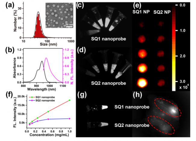 然后為了研究SQ1納米探針在小鼠體內(nèi)的近紅外成像能力,分別對(duì)SQ1納米探針(100μL,100μg)和非靶向SQ1@DSPE(100μL,100μg)進(jìn)行了研究。如圖5f所示,對(duì)于注射SQ1納米探針的小鼠,腫瘤內(nèi)的NIR-II成像信號(hào)顯著增強(qiáng),注射SQ1@DSPE的小鼠腫瘤區(qū)域的熒光增強(qiáng)要弱得多。