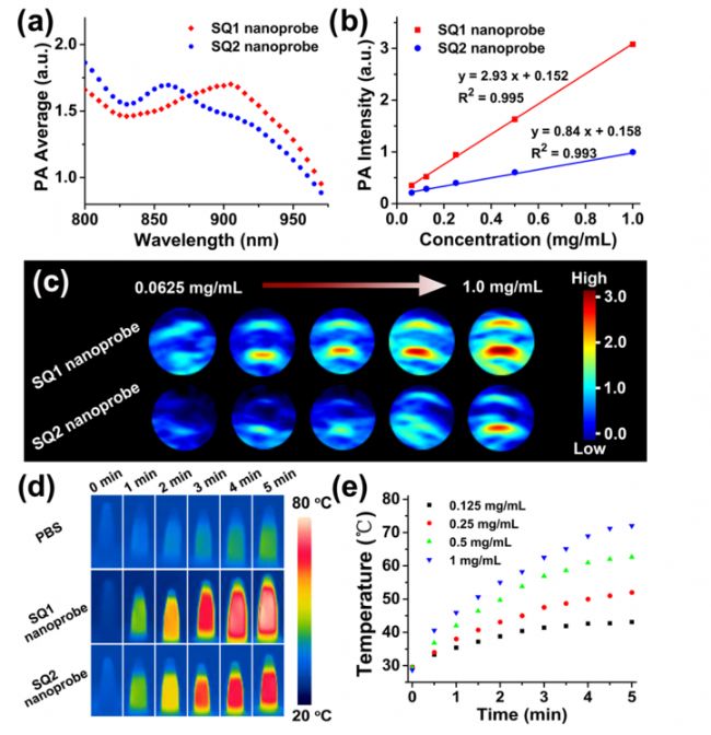如NIR-II和PA成像所示,SQ1納米探針可以很好地累積到MDA-MB-231腫瘤中,這主要是由于SQ1納米探針的有效主動(dòng)靶向,而SQ1@DSPE通過被動(dòng)靶向攝入腫瘤。這些結(jié)果表明SQ1納米探針具有顯著的腫瘤靶向成像能力。NIR-II/PA雙峰成像顯示靶向肽修飾的SQ1納米探針可以特異性結(jié)合纖連蛋白陽性乳腺癌腫瘤。這清楚地表明SQ1納米探針可以準(zhǔn)確地檢測(cè)和表達(dá)纖維連接蛋白陽性乳腺癌的腫瘤病變。