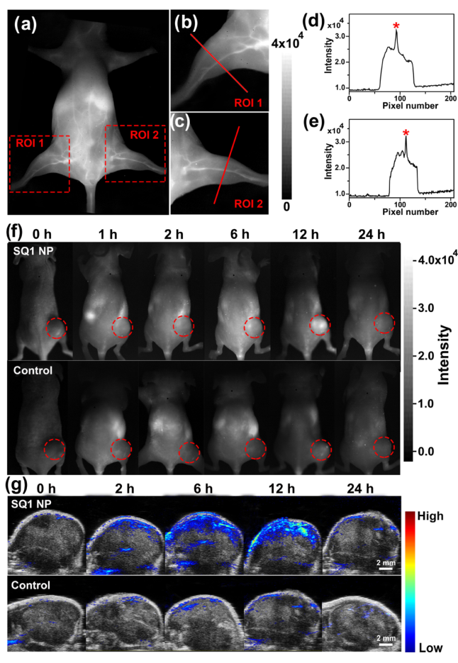圖5:SQ1納米探針的體內(nèi)成像特性,(A)靜脈注射SQ1納米探針10分鐘后,對(duì)小鼠血管進(jìn)行近紅外成像(NIR-II),(b,c)兩個(gè)區(qū)(ROI 1和ROI 2)放大的后肢NIR-II圖像,(d,e)ROI1和ROI2后肢紅線的熒光強(qiáng)度,(F)靜脈注射SQ1納米探針或SQ1@DSPE(對(duì)照)后0、1、2、6、12和24小時(shí),對(duì)陽性的MDA-MB-231腫瘤進(jìn)行NIR-II顯像,(G)在NIR-II顯像后同時(shí)進(jìn)行腫瘤PA顯像,比例尺是2mm