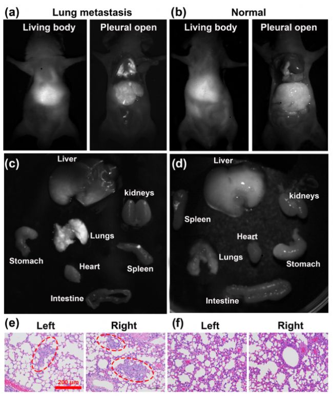 圖6:使用SQ1納米探針對(duì)乳腺癌肺轉(zhuǎn)移小鼠的NIR-II成像,(a,b)靜脈注射SQ1納米探針后12h,(A)荷肺轉(zhuǎn)移瘤小鼠和(B)正常小鼠的NIR-II顯像,(C)肺轉(zhuǎn)移小鼠和(D)正常小鼠全身NIR-II成像后的器官的體外NIR-II成像,(E)肺轉(zhuǎn)移小鼠和(F)正常小鼠肺切片經(jīng)NIR-II成像后進(jìn)行(e,f)H&E組織化學(xué)分析,比例尺為200μm
