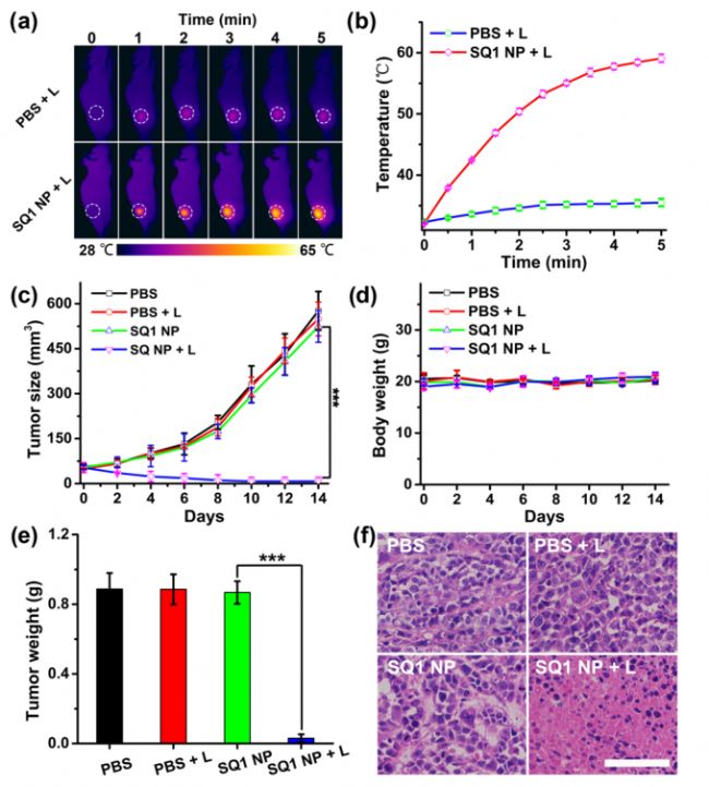 最后,SQ1納米探針具有良好的腫瘤靶向性和良好的體外治療效果,進(jìn)一步促進(jìn)了對(duì)乳腺癌光熱治療的體內(nèi)評(píng)價(jià)。如圖7a,b所示,注射SQ1納米探針的小鼠的腫瘤溫度從33.2°C迅速上升到59.1°C,而PBS預(yù)處理的腫瘤溫度沒有明顯變化。這些結(jié)果證實(shí)了SQ1納米探針在近紅外輻射下確實(shí)能誘導(dǎo)腫瘤發(fā)生顯著的熱變化。為驗(yàn)證其光熱治療效果,對(duì)MDAMB-231乳腺癌荷瘤小鼠分別治療,如圖7c所示,隨著時(shí)間的推移,腫瘤體積的這些差異變得更加明顯。此外,小鼠的體重變化與H&E組織化學(xué)分析顯示SQ1納米探針在近紅外激光照射下對(duì)乳腺癌腫瘤有明顯的光熱損傷作用,具有較高的光熱治療效率。