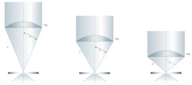 理論上,物鏡前透鏡收集的光錐的最大孔徑角為180°,α值為90°。由于90度的正弦值為1,因此能夠在空氣介質(zhì)中從樣本上收集180°合成光的物鏡的理論NA值也為1。顯然,折射率是實(shí)現(xiàn)物鏡最高NA的限制因素。因此,高NA物鏡都會(huì)用浸泡介質(zhì)代替空氣,如油或水,F(xiàn)實(shí)中,在樣本和物鏡前透鏡之間有空氣的情況下NA值不可能達(dá)到1,因此“干透鏡”(即非浸沒物鏡)的最高NA值接近0.95。這是因?yàn)榇蠖鄶?shù)透鏡無法從樣本中收集180°的光,而最寬的角度約為144°。144°的正弦值為0.95而空氣的折射率為1.0,因此理論上最大值NA接近0.95。