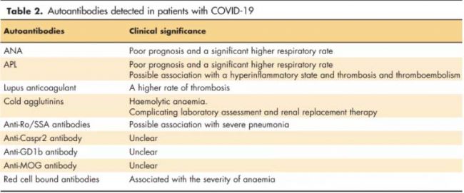 類似,SARS-CoV-2被認(rèn)為是一種引起自身免疫性疾病的病毒(文獻(xiàn)2),目前臨床收集的數(shù)據(jù)顯示COVID-19患者體內(nèi)出現(xiàn)多種類型的自身抗體/自身免疫性疾病。