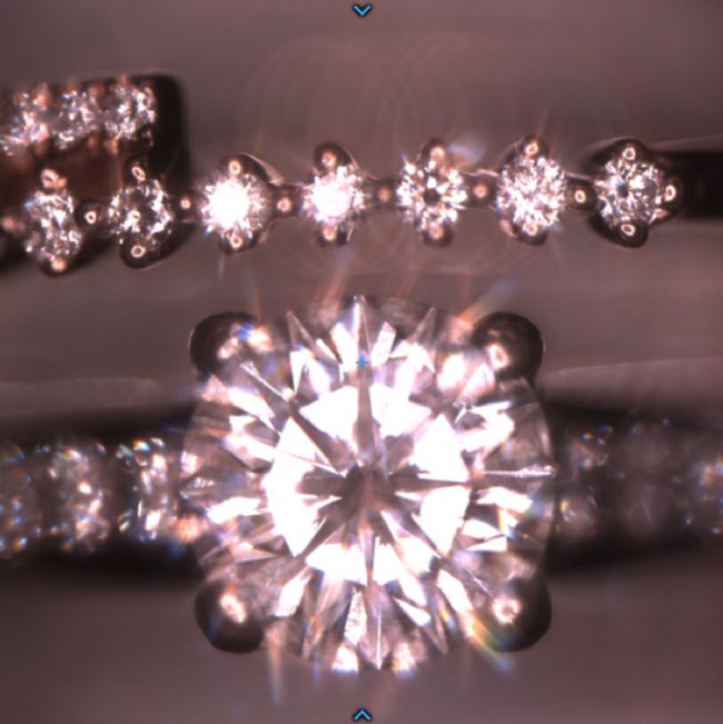 將樣品放入飛納臺式場發(fā)射掃描電鏡 Phenom Pharos G2 中,首先,在光學(xué)顯微鏡導(dǎo)航下,兩枚鉆戒是這樣的,依舊璀璨無比。