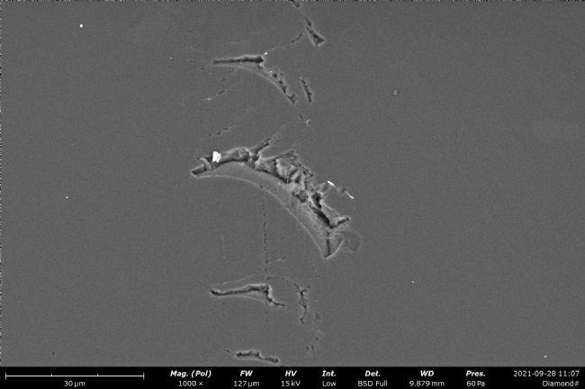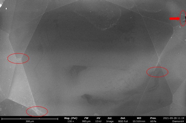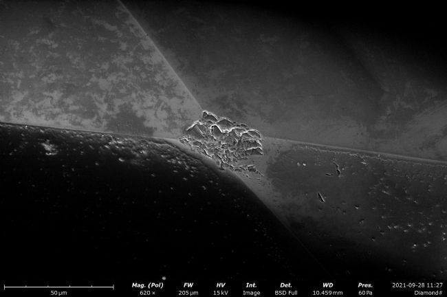 我們可以發(fā)現(xiàn),碎鉆的表面,并不是那么完美,碎鉆的表面有很多瑕疵,切工比較粗糙,我們進(jìn)一步放大看看這些缺陷的位置。進(jìn)一步放大后,碎鉆表面的缺陷非常明顯,有各種各樣的裂紋,并且表面不夠干凈平整。