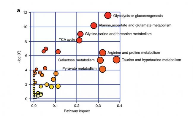 采用了基于氣相色譜飛行時(shí)間質(zhì)譜(GC-TOF/MS)的代謝組學(xué)方法來研究骨髓中代謝物的改變。在總離子電流分布中,鑒定出543個(gè)有效峰(圖A)。偏最小二乘判別分析(PLS-DA)和正交偏最小二乘判別分析(OPLS-DA)顯示了兩組之間的聚類顯著分離(圖B,C,D)。