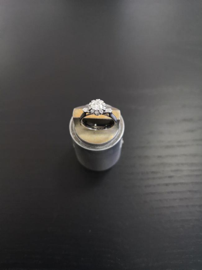 鉆石在光鏡下璀璨閃耀,切換到掃描電鏡下觀察,在背散射電子圖像上,可以看到中間的鉆石是較深的黑色,四周的金屬鉆托是較亮的白色,成分對(duì)比非常明顯。小編也比較好奇具體成分是什么,于是做了個(gè)能譜進(jìn)一步進(jìn)行成分的判斷。