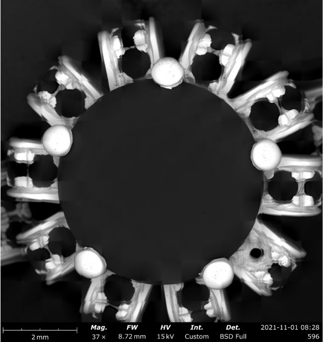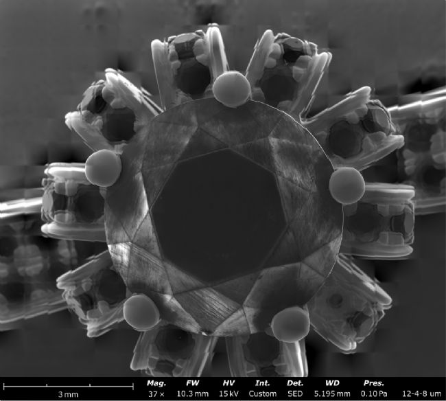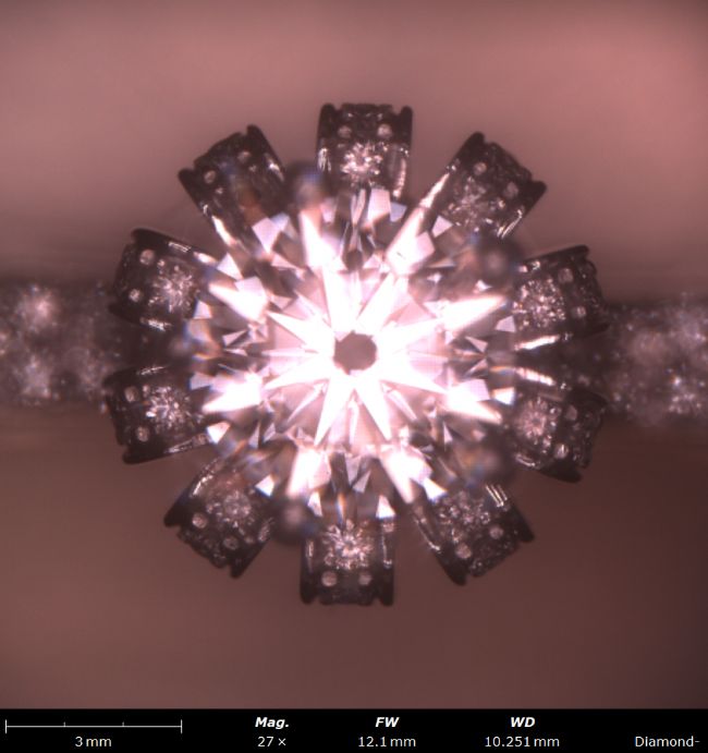 二次電子像可以看出整顆鉆石的輪廓,有助于判斷鉆石切工的好壞和切割類型,這顆人工鉆石切工相對(duì)較好,且屬于典型的明亮式切割。
