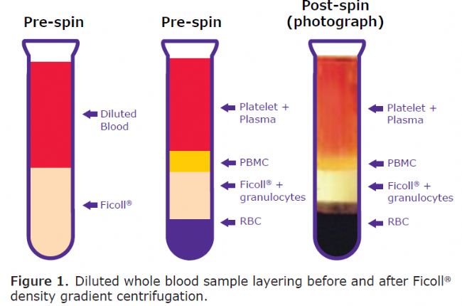 使用Ficoll®進(jìn)行密度梯度離心,可將全血特征性地分離為4層:最上層的血漿層含有血小板、一層很薄的PBMC帶、彌漫性Ficoll®層含有粒細(xì)胞和聚集的紅細(xì)胞顆粒。PBMC可進(jìn)一步細(xì)分為兩個(gè)主要群體:淋巴細(xì)胞和單核細(xì)胞。