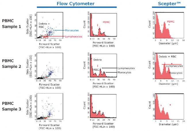 Representative data comparing PBMC samples acquired on the flow cytometer and Scepter™ cell counter. Dot plots show debris