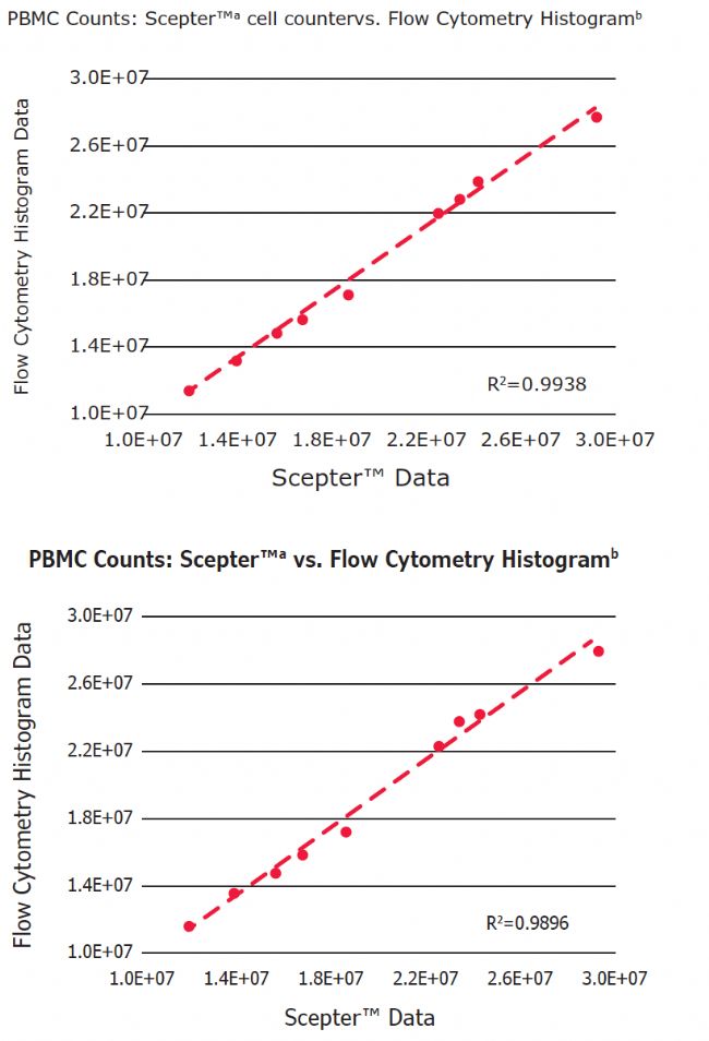 Figure 3. Correlation of PBMC concentrations measured using three different methods of analysis: flow cytometric cell counting, Scepter™ cell counting, and flow cytometry analysis of fluorescently labeled cells.