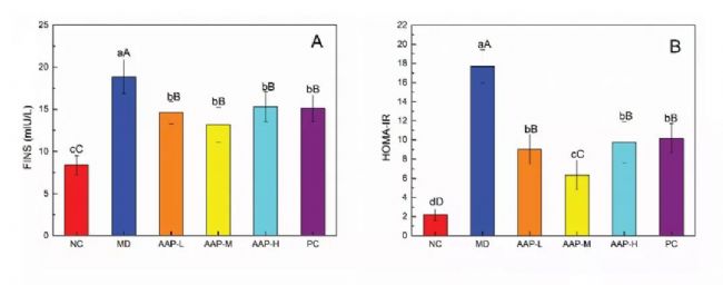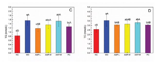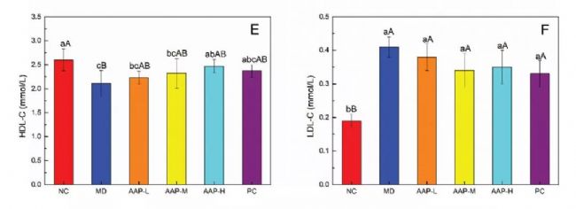 血清胰島素水平升高在早期T2DM患者中非常常見。因此,AAPs對T2DM小鼠胰島素拮抗具有一定的保護(hù)作用。流行病學(xué)研究表明,DM常伴有血脂異常,主要表現(xiàn)為TC、TG、LDL-C升高,HDL-C水平降低。如圖1所示,與NC組比較,MD組TC、TG、LDL-C水平顯著升高(P< 0.01), HDL-C水平顯著降低(P< 0.01)。AAP組和二甲雙.胍組小鼠的TC、TG、LDL-C水平均高于正常組,進(jìn)一步證實T2DM小鼠血脂水平異常。AAP-L、PC組TG、TC顯著低于MD組(P< 0.05)。因此,服用AAPs或二甲雙.胍可以緩解TG和TC的升高。目前,血脂異常對T2DM病程的影響仍存在爭議。尼日利亞的一項研究表明,糖尿病持續(xù)時間和血脂異常之間沒有顯著相關(guān)性(P> 0.05)。這些結(jié)果與當(dāng)前結(jié)果之間的差異可能是由于血糖控制和使用的樣本量、環(huán)境影響以及其他方面的差異造成的。