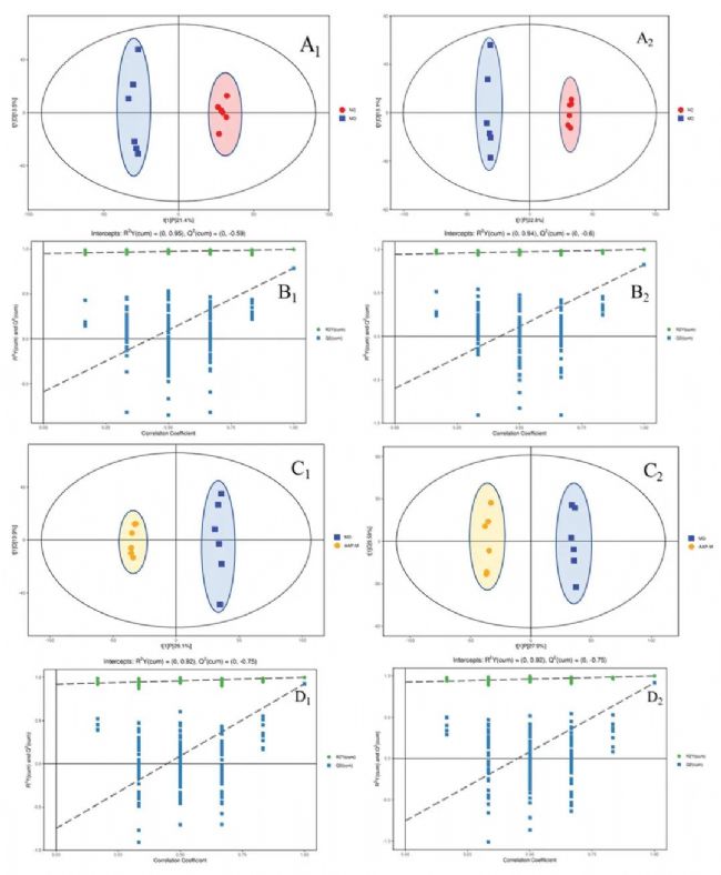 基于上述結(jié)果,AAP-M組改善緩解效果相對較好,選擇NC和MD為研究對象,通過UHPLC-QE HFX-MS技術(shù)進(jìn)行代謝物檢測分析進(jìn)一步探討AAP對T2DM代謝通路的積極作用。在血清樣本POS和NEG離子模式下的PCA圖中,MD和AAP-M組均與NC組明顯分離,表明T2DM模型建立成功(圖3A-B)。因此,AAP給藥200mg/kg b.w后小鼠的代謝物與MD組有顯著差異。由于代謝數(shù)據(jù)具有復(fù)雜的多維特性,單靠無監(jiān)督PCA模型分析無法很好地區(qū)分樣本間的組間差異。因此,使用OPLS-DA進(jìn)行數(shù)據(jù)分析,OPLS-DA得分圖顯示MD組和NC組在兩種模式下的代謝譜明顯分離,置換檢驗表明模型穩(wěn)定可靠(圖3)。PCA和OPLS-DA結(jié)果進(jìn)一步證實了我們STZ誘導(dǎo)T2DM小鼠模型的成功建立,AAP-M給藥可以調(diào)節(jié)小鼠的代謝譜。