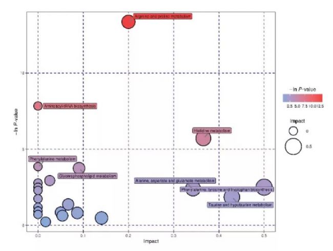 圖5. 代謝通路的氣泡圖及相關(guān)途徑代謝物變化
