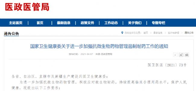 為進(jìn)一步加強(qiáng)抗微生物藥物管理,積極應(yīng)對(duì)微生物耐藥,2021年4月2日,國(guó)家衛(wèi)生健康委發(fā)布《關(guān)于進(jìn)一步加強(qiáng)抗微生物藥物管理遏制耐藥工作的通知》,要求規(guī)范細(xì)菌、支原體、衣原體、立克次體、螺旋體、真菌等病原微生物所致感染性疾病藥物治療,提高合理用藥水平,并加強(qiáng)宣傳引導(dǎo)抗微生物藥物使用誤區(qū)和不合理使用的危害,糾正患者不規(guī)范的自我治療行為。