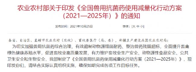 2021年10月25日,農(nóng)業(yè)農(nóng)村部也發(fā)布了《全國(guó)獸用抗菌藥使用減量化行動(dòng)方案(2021-2025年)》,要求建立完善并嚴(yán)格執(zhí)行獸藥安全使用管理制度,做到規(guī)范科學(xué)用藥。