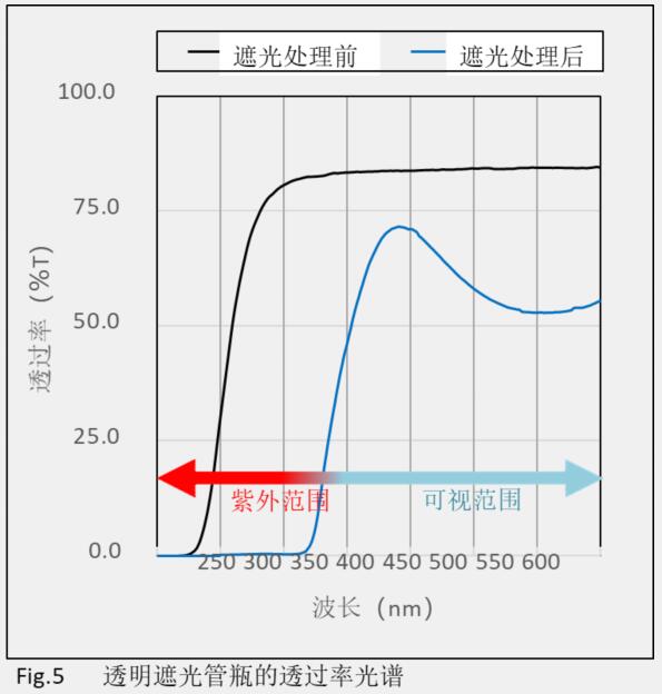 為了解決上述困擾,日本巖田硝子工業(yè)株式會(huì)社開發(fā)了既透明又具有遮光功能的管瓶(已取得專利)。通過特殊處理工藝,在保持容器內(nèi)可視的同時(shí),將紫外線大幅遮蔽。