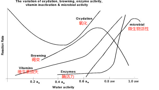 由上圖,可以看出水活度和產(chǎn)品中的脂類氧化、褐變、維生素流失、酶的活性以及微生物生長有著密切關(guān)系。產(chǎn)品中發(fā)生的生化反應(yīng)(如美拉德反應(yīng))和酶促反應(yīng)是引起產(chǎn)品品質(zhì)變化的重要原因之一,降低產(chǎn)品的水分活度可以延緩酶促褐變和非酶褐變的進行。同時,低水分活度能抑制產(chǎn)品的化學變化,穩(wěn)定食品質(zhì)量。