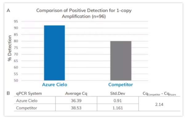 使用探針法,同時在Azure Cielo™實時熒光定量PCR系統(tǒng)和其他品牌產(chǎn)品上檢測GAPDH基因,結(jié)果表明:A)Azure Cielo™實時熒光定量PCR系統(tǒng)對單拷貝基因的檢出率更高。B)Azure Cielo™實時熒光定量PCR系統(tǒng)的Cq平均值要低于2個Cq。