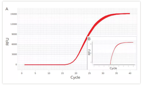 如圖所示,標(biāo)準(zhǔn)的擴(kuò)增曲線是呈現(xiàn)S型的。曲線是否符合標(biāo)準(zhǔn),不僅跟樣本起始量、qPCR體系配制、反應(yīng)程序等相關(guān),更依賴于一套高品質(zhì)的實時熒光定量PCR系統(tǒng)。對于實時熒光定量PCR系統(tǒng)來說,高度檢測靈敏度、高度重復(fù)性和高度穩(wěn)定性,是每一臺qPCR儀的追求。