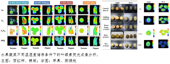 早在2014年,韓國韓京大學(xué)的科學(xué)家就使用FluorCam葉綠素?zé)晒獬上裣到y(tǒng)測量西紅柿、辣椒、蘋果、獼猴桃等水果蔬菜在不同儲存條件下(室溫、低溫、高溫、高濕)的品質(zhì)變化,通過最小熒光Fo、最大熒光Fm、最大光化學(xué)效率Fv/Fm和非光化學(xué)淬滅系數(shù)NPQ,從光合生理的角度證實低溫是最佳的常規(guī)水果蔬菜保鮮技術(shù)。