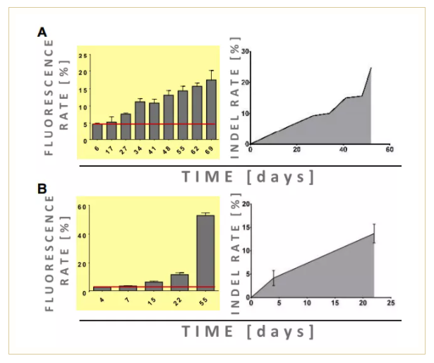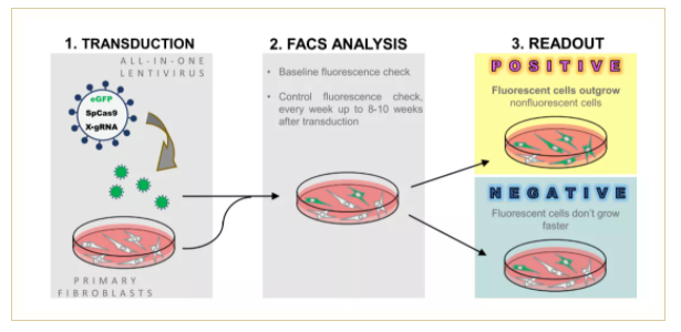 LATE檢測(cè)的原理包括 (1)用編碼熒光蛋白、設(shè)計(jì)的核酸酶(Cas9)和gRNA的慢病毒載體轉(zhuǎn)導(dǎo)原代人類(lèi)新生兒包皮成纖維細(xì)胞 (NUFF),(2) 使用流式細(xì)胞術(shù)分析轉(zhuǎn)導(dǎo)率并連續(xù)監(jiān)控長(zhǎng)達(dá)10周,(3)讀取結(jié)果,隨著轉(zhuǎn)導(dǎo)細(xì)胞數(shù)量的增加,作為基因組編輯效應(yīng)的細(xì)胞獲得生長(zhǎng)優(yōu)勢(shì)