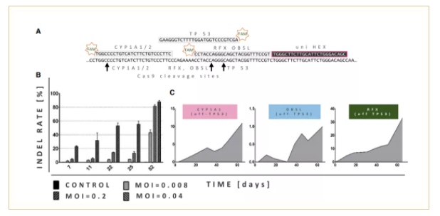 隨后進(jìn)行Stilla naica®微滴芯片數(shù)字PCR系統(tǒng)檢測(cè),結(jié)果顯示隨著時(shí)間的推移,TP53插入缺失的頻率隨之增加,轉(zhuǎn)導(dǎo)后第7天插入缺失率為1%–22%,在52天后達(dá)到44%–85%的峰值,該變化趨勢(shì)和細(xì)胞獲得生長(zhǎng)優(yōu)勢(shì)的趨勢(shì)一致。(圖2B)