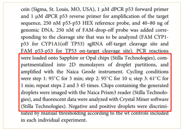文中使用Stilla naica®微滴芯片數(shù)字PCR系統(tǒng)進(jìn)行GFR-dPCR方法檢測(cè),實(shí)驗(yàn)方法詳見(jiàn)原文第12頁(yè)。