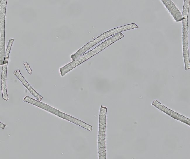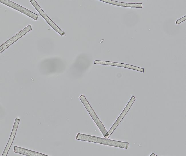 鄂爾多斯的毛衣,放大倍數(shù) 1000x,視野內(nèi)的纖維都具有鱗片,并且鱗片較薄,條干均勻和一致性比較好,手感會相對細(xì)膩,基本可以判斷是屬于絨。