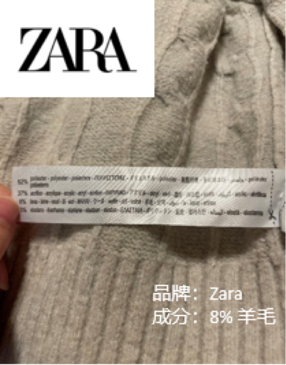 看這件 Zara 的毛衣,視野里具有鱗片的纖維是有那么兩根,不過這是不是有點(diǎn)少啊,仔細(xì)一看,人家本來也就只含有 8% 的羊毛,嗯,也合理。