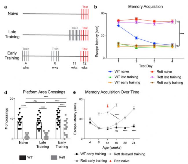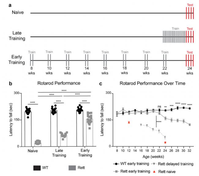 實(shí)驗(yàn)使用MeCP2雜合子雌性小鼠作為雷特綜合征模型,這些雷特小鼠會(huì)在產(chǎn)后12周左右出現(xiàn)運(yùn)動(dòng)不協(xié)調(diào)的現(xiàn)象,并逐漸惡化。研究人員將這些雷特小鼠分為三個(gè)組別,分別為在早期就開始行為訓(xùn)練,晚期開始行為訓(xùn)練和不訓(xùn)練組,并與野生型一起測(cè)試機(jī)能表現(xiàn)和神經(jīng)活動(dòng)。