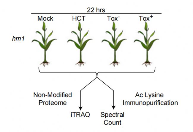 組蛋白乙;癄顟B(tài)的改變?cè)谒拗?病原體相互作用中起著核心作用。關(guān)于HCT如何實(shí)際促進(jìn)毒性的機(jī)理仍然未知。因此作者選擇hmlA玉米突變株作為研究對(duì)象,該突變株是編碼依賴NADPH的HC-毒素還原酶(HCTR)缺陷型,不能使HCT失活,表現(xiàn)出對(duì)C. carbonum race 1的易感。應(yīng)用iTRAQ標(biāo)記蛋白組和乙酰化修飾蛋白組技術(shù)研究玉米真菌誘導(dǎo)機(jī)制。