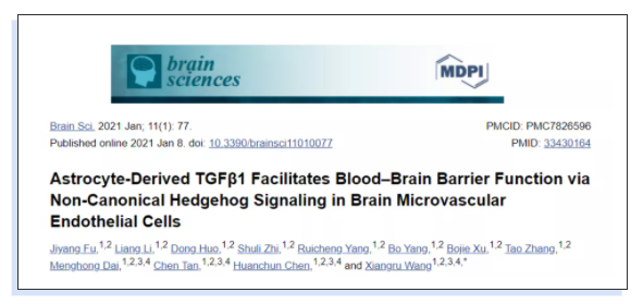 華中農(nóng)業(yè)大學(xué)獸醫(yī)學(xué)院農(nóng)業(yè)微生物學(xué)國家重點(diǎn)實(shí)驗(yàn)室和湖北省預(yù)防獸醫(yī)學(xué)重點(diǎn)實(shí)驗(yàn)室聯(lián)合在Brain Sciences雜志上發(fā)表了一篇名為《Astrocyte-Derived TGFβ1 Facilitates Blood–Brain Barrier Function via Non-Canonical Hedgehog Signaling in Brain Microvascular Endothelial Cells》,該文闡明了TGFβ1 介導(dǎo)的星形膠質(zhì)細(xì)胞和大腦內(nèi)皮細(xì)胞之間的細(xì)胞間交流,這一發(fā)現(xiàn)將拓寬關(guān)于血腦屏障內(nèi)穩(wěn)態(tài)的現(xiàn)有知識(shí),也可能有助于進(jìn)一步改善血腦屏障功能障礙的治療策略。