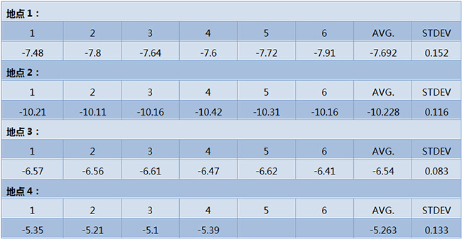 用現(xiàn)場采樣器從不同地方采集4組大氣樣品, 通過8070 AIR_CO2 和 IRMS進行重現(xiàn)性測試,結(jié)果如下: