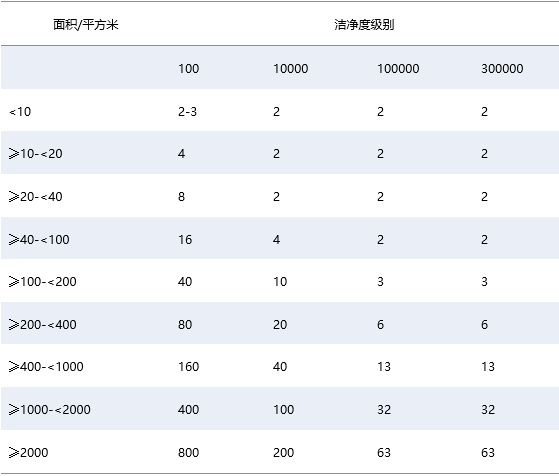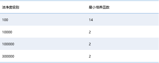 注:常規(guī)超凈臺或安全柜潔凈度級別:100級;常規(guī)細胞房潔凈度級別:10000級;這里的最小培養(yǎng)皿數(shù)是所有采樣點皿數(shù)總和。