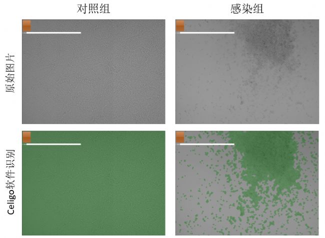 宿主細胞被病毒感染后發(fā)生皺縮或堆疊,顏色發(fā)暗,但未發(fā)生脫落。Celigo軟件的紋理算法可通過對比度的差異區(qū)分有病變和沒有病變的細胞,并計算出病變細胞的融合率。