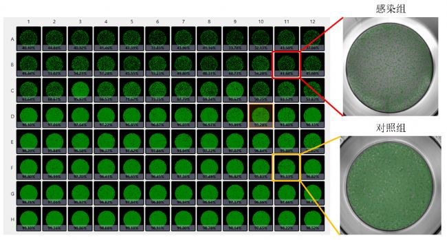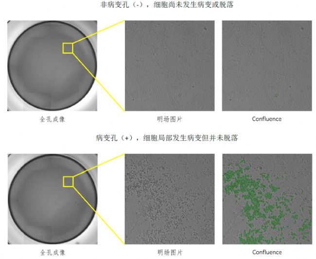 宿主細胞被細胞感染后死亡、脫落,孔底出現(xiàn)大片空白區(qū)域。Celigo軟件可以通過紋理 (Texture) 算法識別細胞覆蓋的區(qū)域,并計算細胞融合率 (Confluence),快速分析整板每孔CPE的程度。