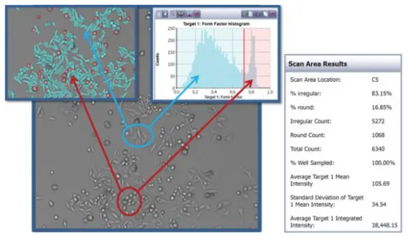 Celigo軟件專門為病毒/疫苗相關(guān)應用開發(fā)了一套算法。針對CPE有多種分析方法,分別應對不同的病變類型,包括細胞脫落,細胞皺縮/腫脹和細胞的形態(tài)變化等。