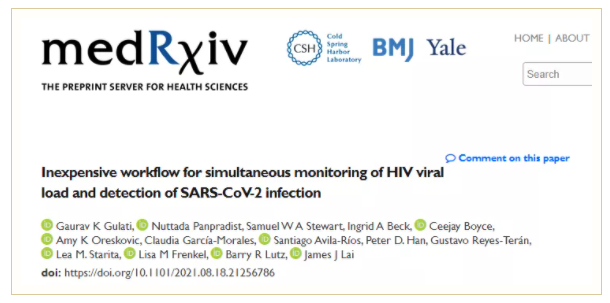 COVID-19大流行中斷了對(duì)艾滋病病毒感染者的常規(guī)護(hù)理,嚴(yán)重影響了對(duì)艾滋病病毒感染者的診斷和治療。如果感染SARS-CoV-2, 艾滋病病毒感染者的發(fā)病率和死亡率會(huì)增加。據(jù)報(bào)道,近日在南非發(fā)現(xiàn)新冠新型變異毒株Omicron可能由艾滋患者體內(nèi)進(jìn)化而來。因此密切監(jiān)測(cè)HIV血漿病毒載量(VL)并篩查SARS-COV-2感染就顯得尤為迫切。近日,來自華盛頓大學(xué)的Gaurav K Gulati和Nuttada Panpradist等科學(xué)家在medRxiv平臺(tái)上提交文章《Inexpensive workflow for simultaneous monitoring of HIV viral load and detection of SARS-CoV-2 infection》的預(yù)印本。