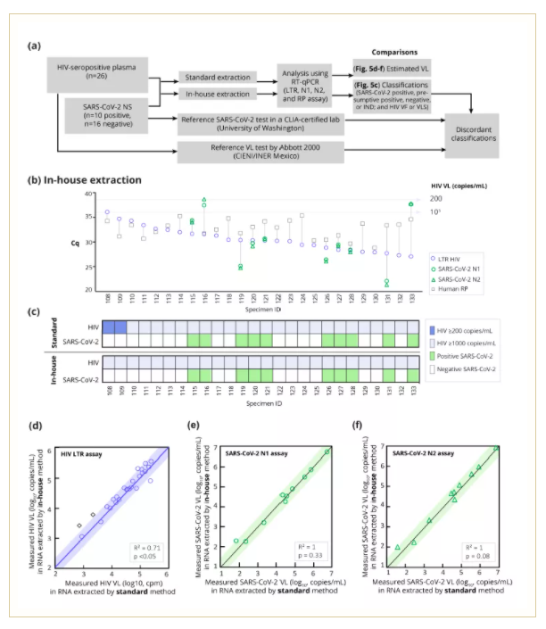 圖2:使用兩種不同提取方法從血漿和NS混合樣本中共同提取的RNA中獲得的HIV LTR 和SARS-CoV-2 Cq值的比較.(a)比較標(biāo)準(zhǔn)與內(nèi)部提取方法性能的實(shí)驗(yàn)設(shè)計(jì)方案。(b)來自內(nèi)部提取方法的SARS-CoV-2 LTR、N1、N2和人 RP (陰性樣本的對(duì)照)測(cè)定的Cq值。(c)基于兩種提取方法的結(jié)果對(duì)樣本進(jìn)行分類。通過兩種方法提取的樣本中測(cè)得的(d)LTR、(e)N1和(f)N2的散點(diǎn)圖。