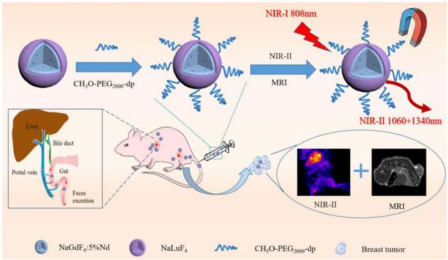作者開發(fā)了一種簡單的熒光成像策略:合成了在NIR-II窗口中具有強(qiáng)烈發(fā)射的Nd3+摻雜稀土核殼納米顆粒(Nd-RENPs),NaGdF4:5%Nd@NaLuF4。更重要的是,Nd-RENPs可以從肝膽通路中迅速消除,從而降低RES長期保留的潛在風(fēng)險(xiǎn)。此外,研究者將Nd-RENPs成功用于NIR-II成像和磁共振成像(MRI)造影劑,從而能夠精確檢測乳腺癌。
