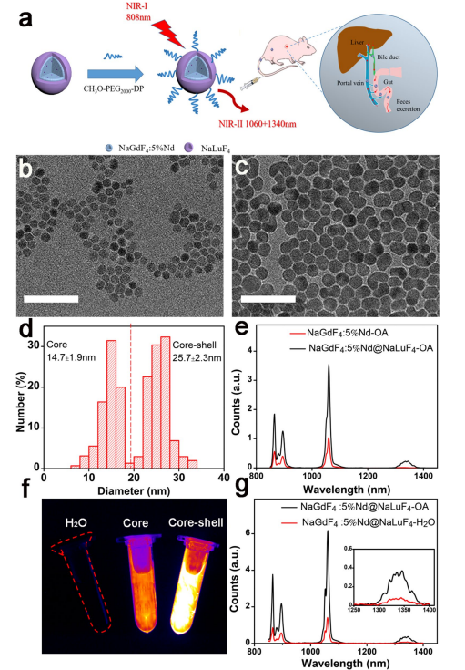 研究者首先利用LSS合成法合成了NaGdF4:5%Nd核心與NaLuF4殼層,隨后用兩端分別為甲氧基和二磷酸基的聚乙二醇(PEG)進(jìn)行表面改性。材料合成后,對之進(jìn)行了一系列表征(圖1)。