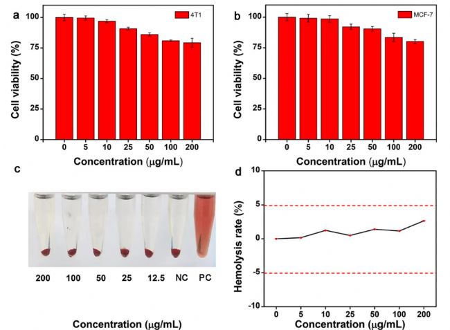 生物相容性對于成像探針的應(yīng)用至關(guān)重要。本研究通過MTT和溶血率測定法研究了PEGylated NaGdF4:5%Nd@NaLuF4的潛在細(xì)胞毒性。圖2a和b顯示,即使Gd3+濃度高達(dá)200μg/mL,用Nd-RENPs處理24小時后,細(xì)胞存活(4T1和MCF-7細(xì)胞)也超過80%。此外,紅細(xì)胞的溶血率顯著低于5%,表明Nd-RENP具有顯著的血液相容性(圖2c,d)。