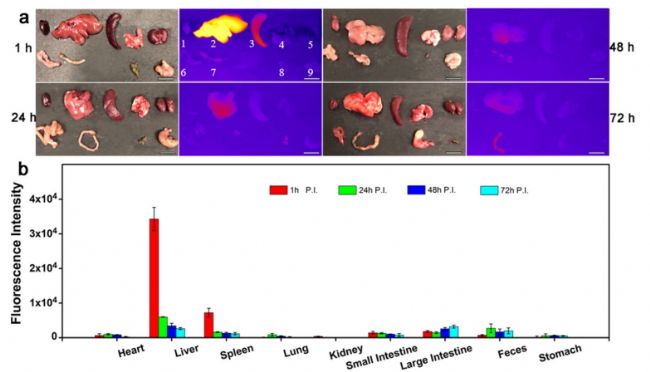 圖5: Nd-RENPs的生物分布。a 在靜脈給藥后1、24、48和72 h處,主要器官的NIR-Ⅱ成像。b主要器官1.心臟,2.肝臟,3.脾臟,4.肺,5.腎,6.小腸,7.大腸和9.胃)和8.不同時間點(diǎn)糞便的NIR-II熒光強(qiáng)度的定量分析。(比例尺:10 mm,n=3)